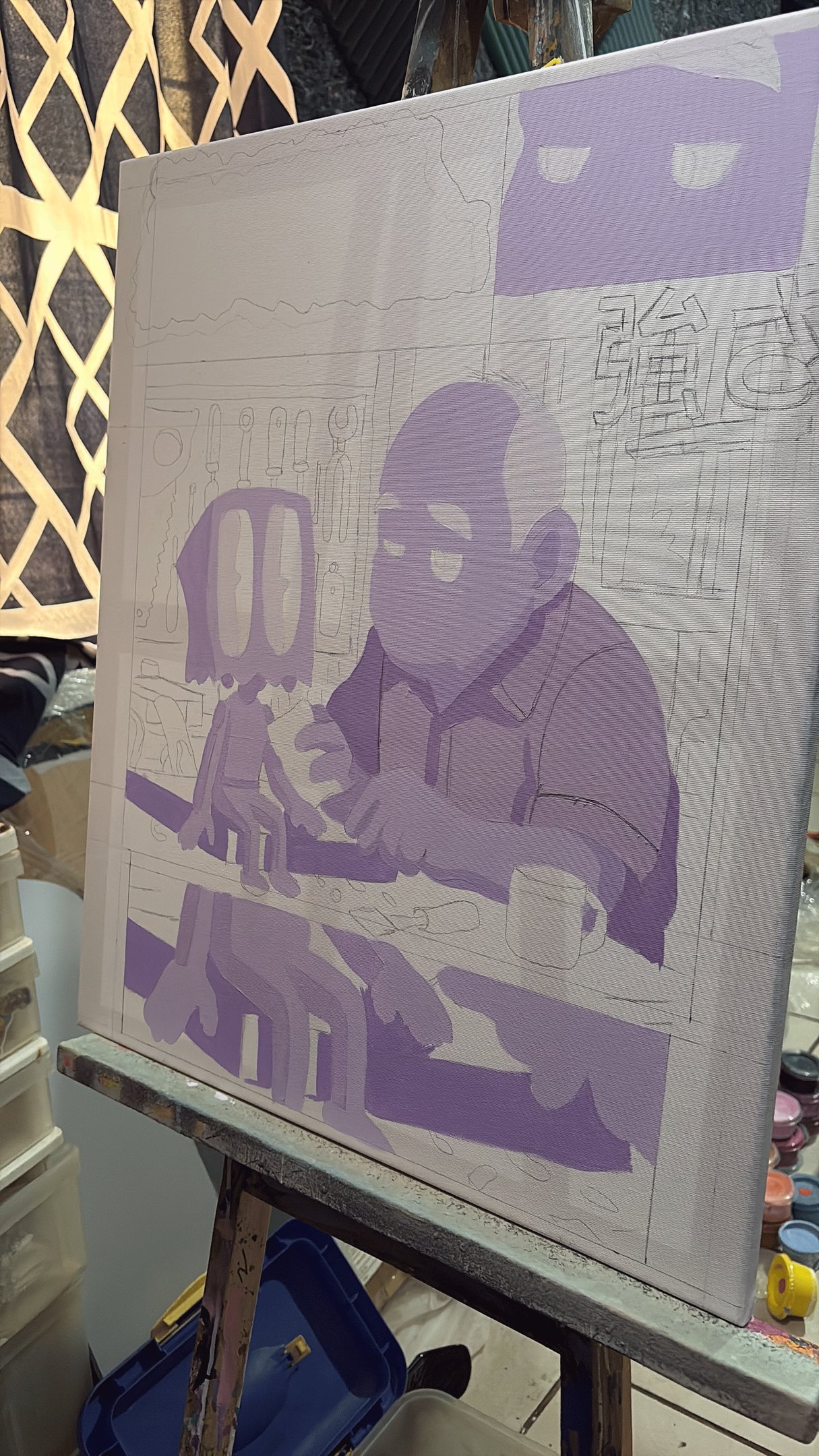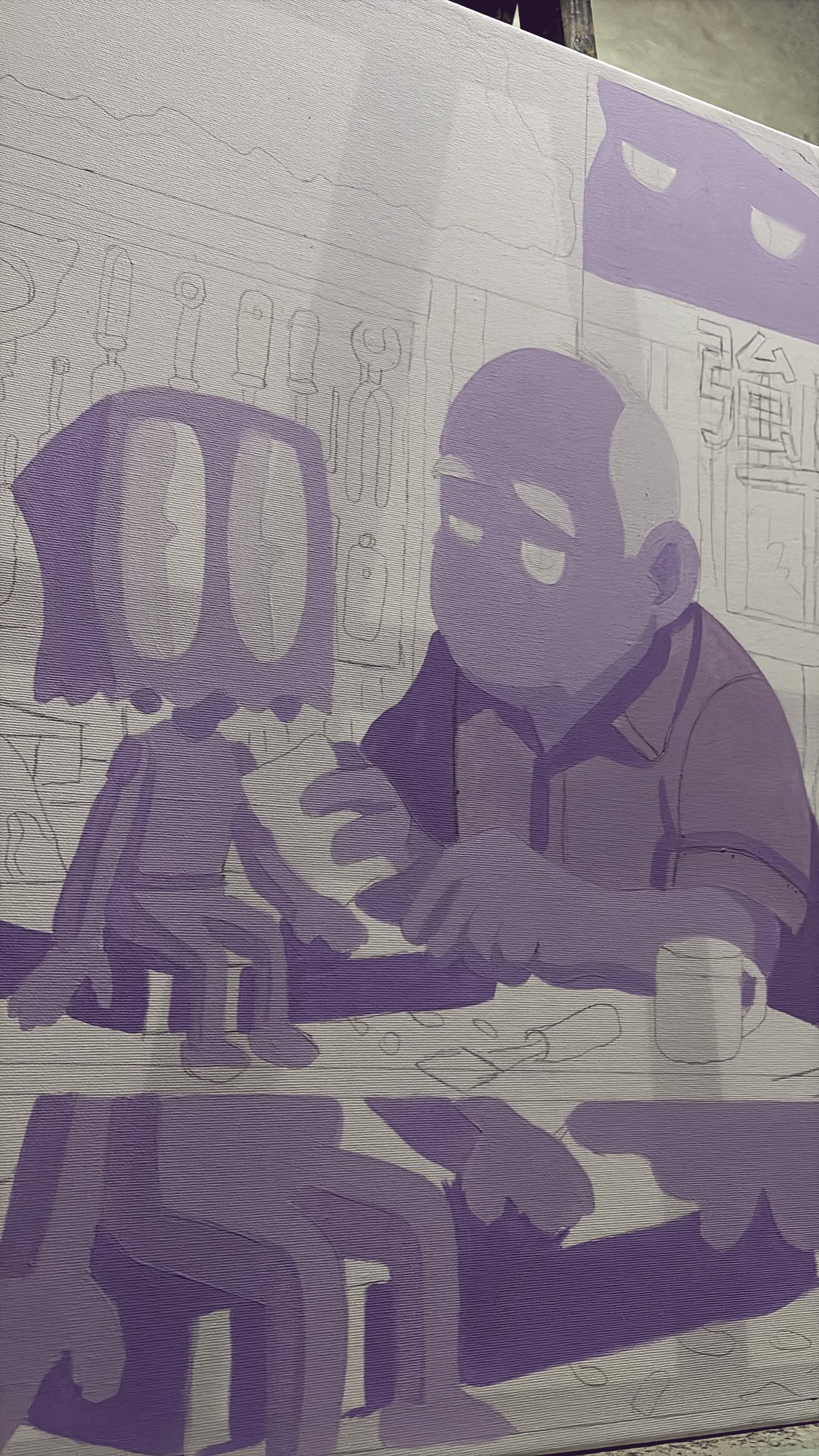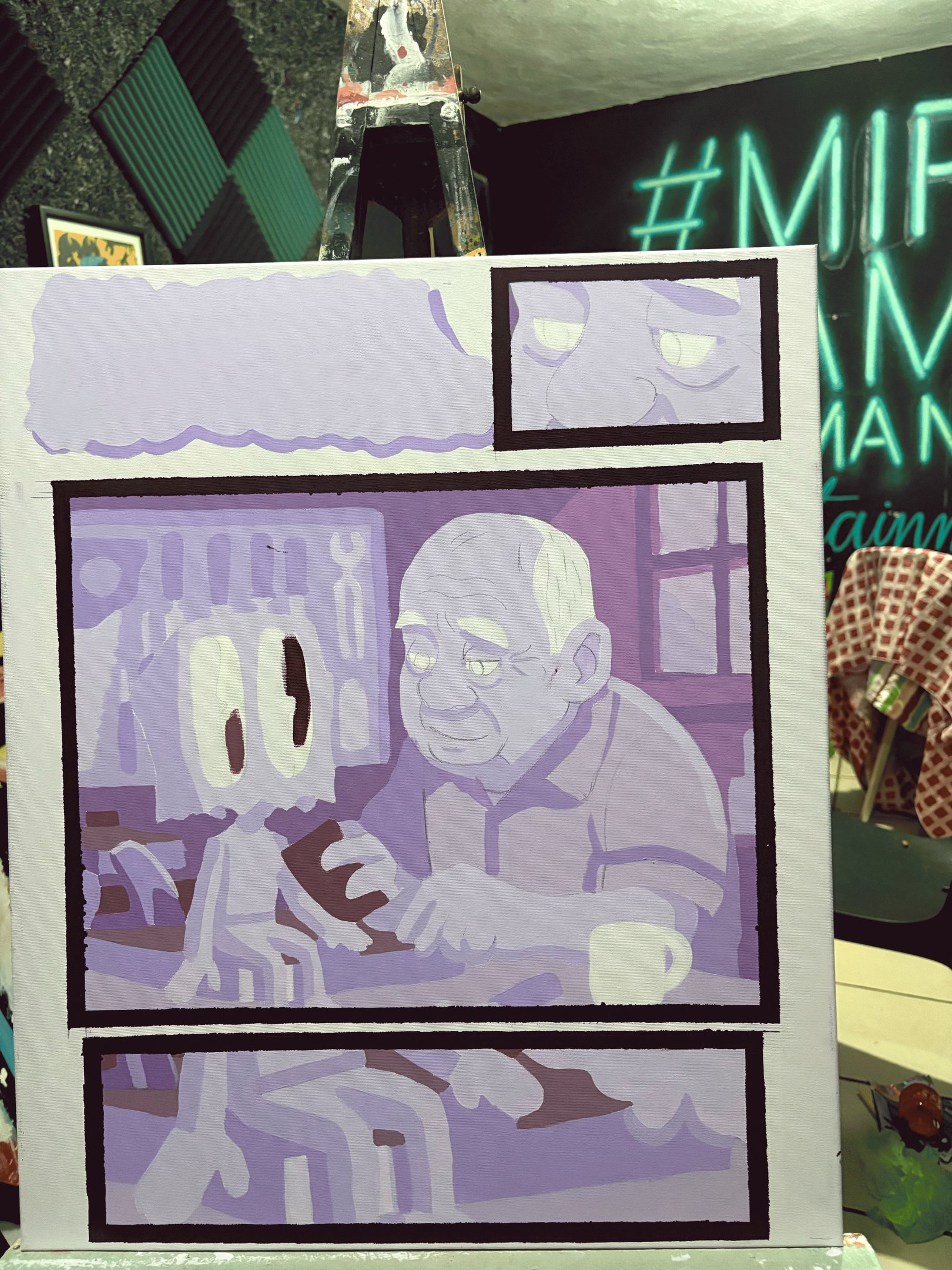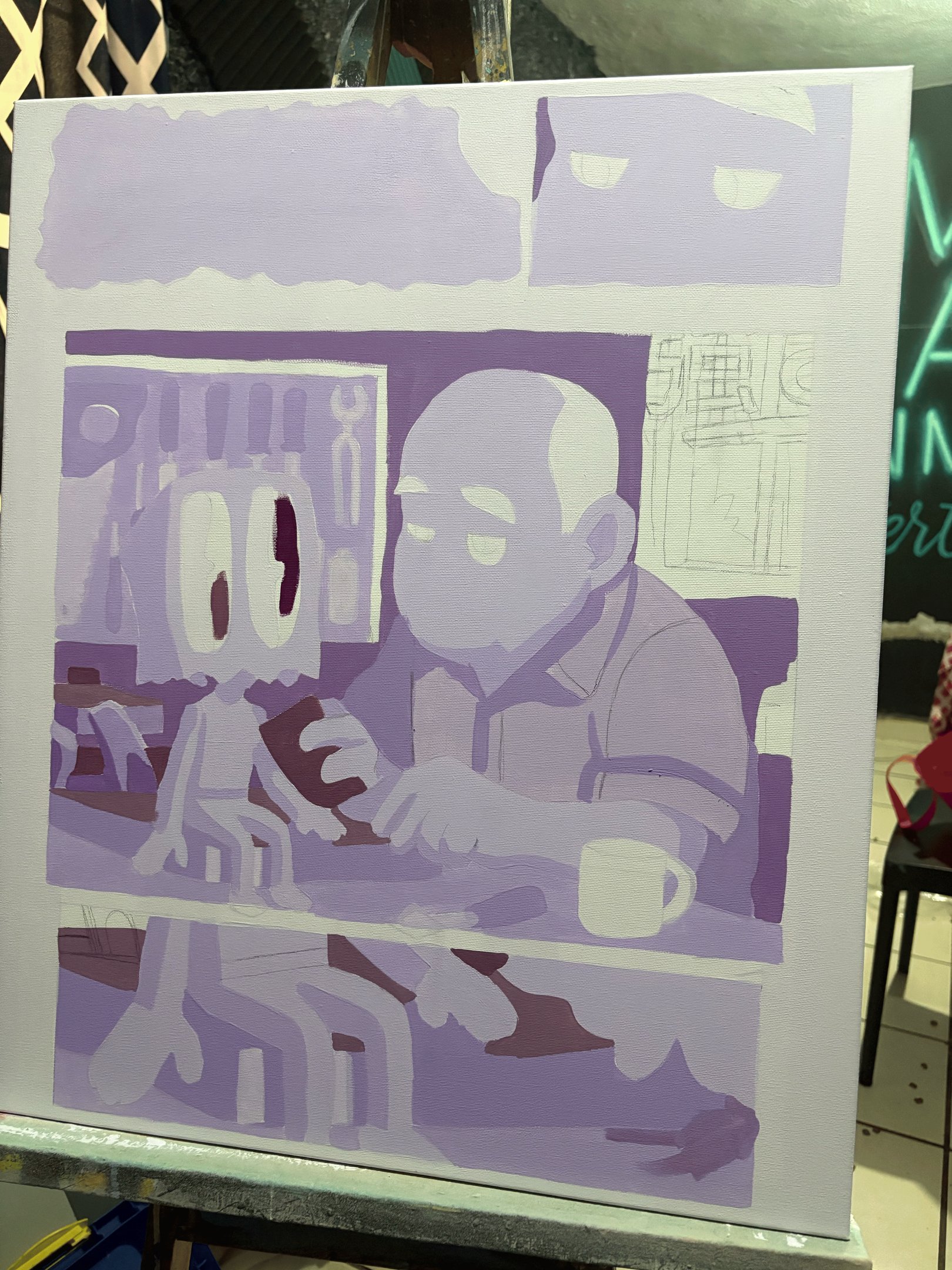 Después de un arduo trabajo de lo que fue mi galería "Tristeza, Amor & Fe", me invitaron a participar en esta nueva exposición artística. No tenía idea de que realizaría algo tan especial y cautivador, pero había estado pensando en sumergirme en una paleta de colores morados, ya que venía acumulando estas ganas de pintar únicamente con tonalidades moradas. En la idea de ilustración, deseaba plasmar la imagen de mi abuelo, un ser querido que a lo largo de toda su vida fue carpintero.