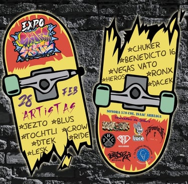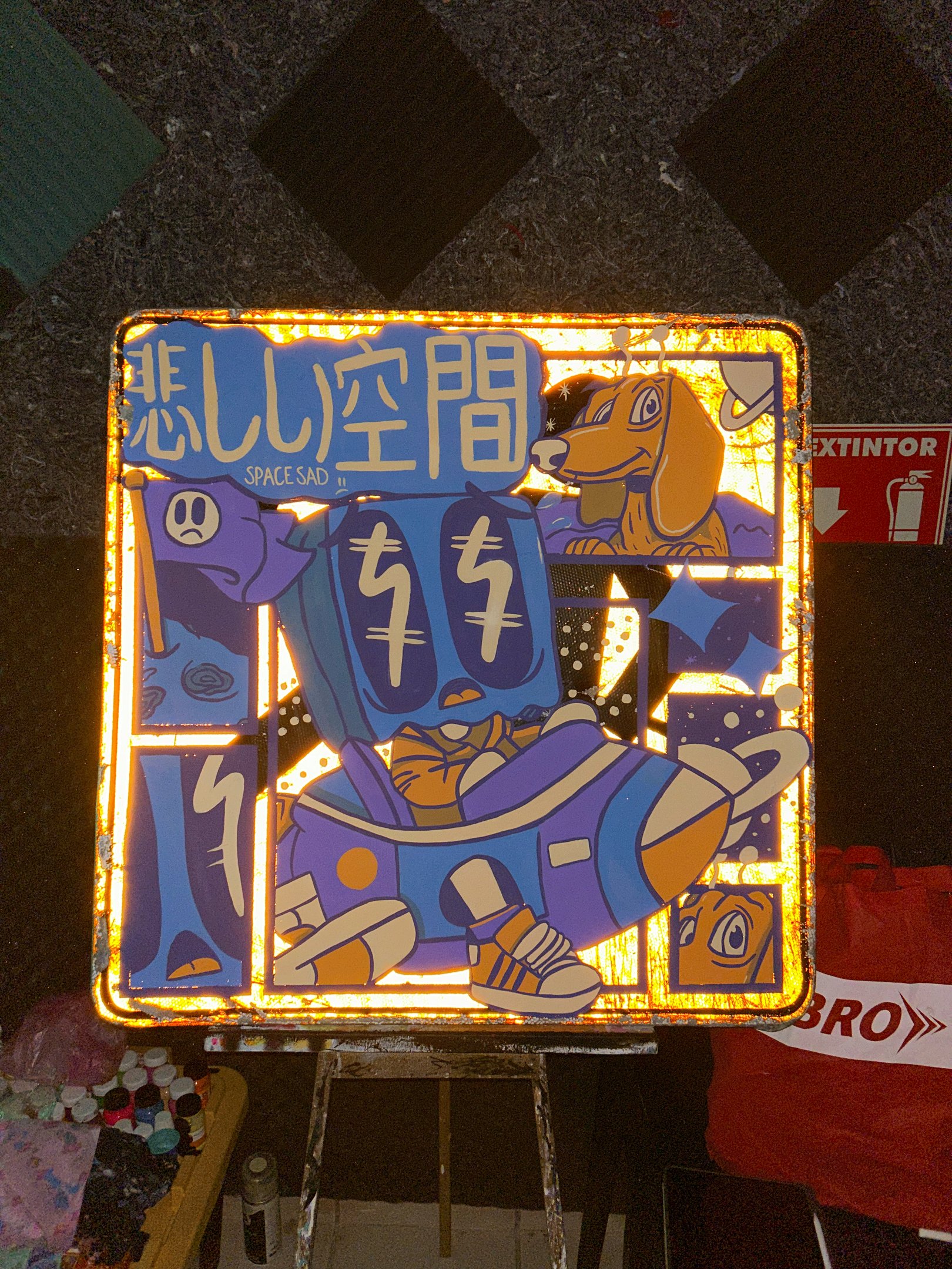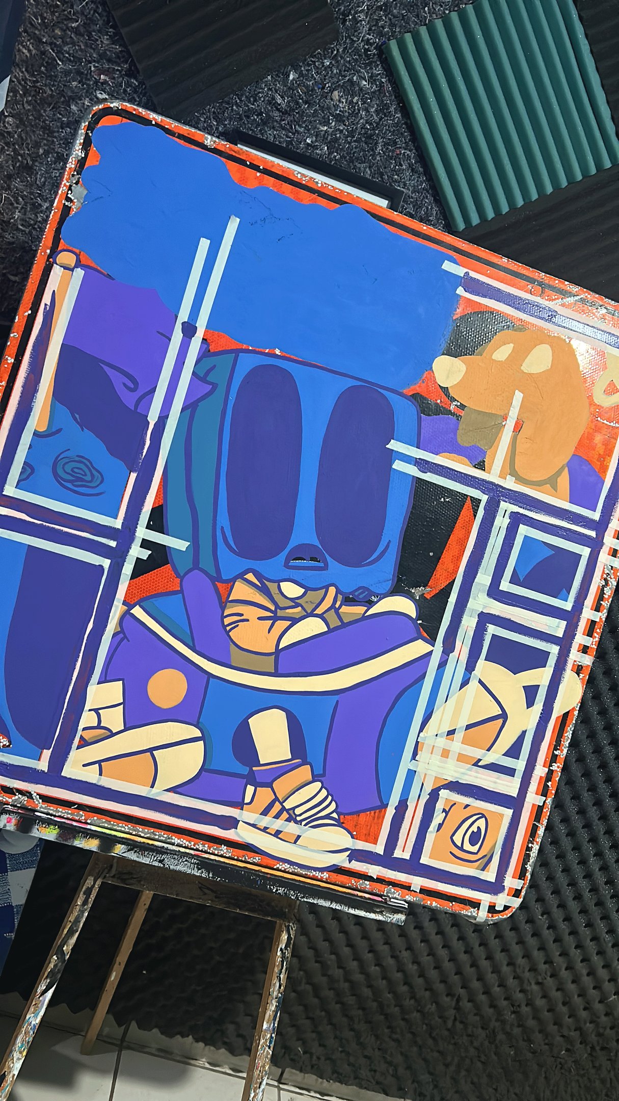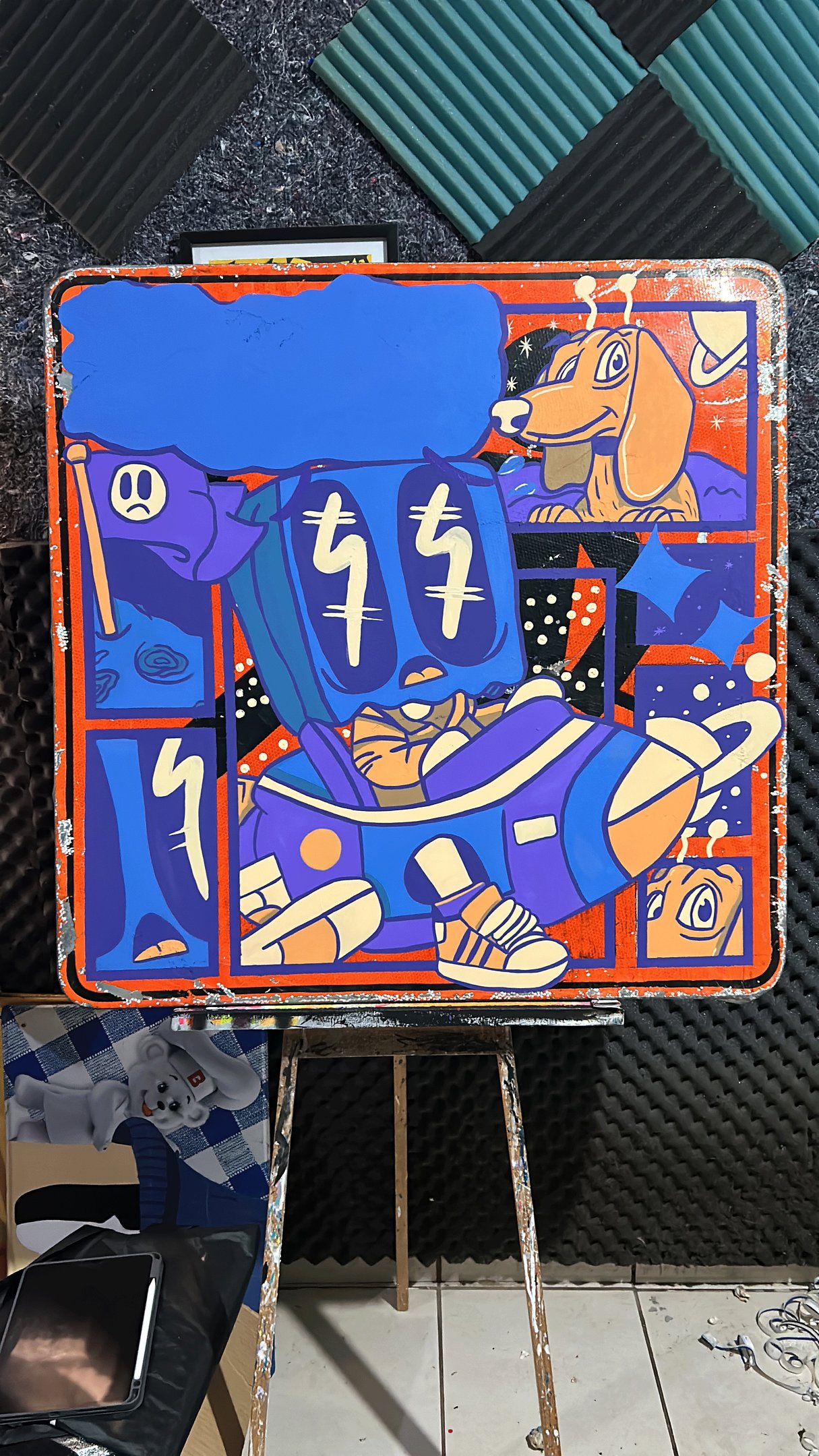 Fui invitado a participar en esta expo la cual fue relacionada al skate, donde la mayoría de los artistas pintaron patinetas para seguir con el concepto. Sin embargo, a algunos artistas nos ofrecieron intervenir unos letreros de metal de construcción, lo cual fue mucho más gratificante de lo que inicialmente había anticipado. Pintar esos letreros me permitió explorar nuevas técnicas y conceptos, permitiéndome jugar con una composición cuadrada y utilizar el reflector de metal para aportar un elemento luminoso y dinámico a la obra. Además, el material en sí dio una textura interesante que contrastaba con el color de la pintura, creando un efecto visual único que llamaba la atención del espectador.