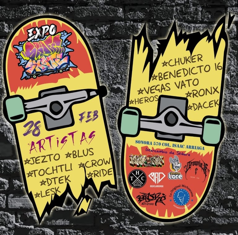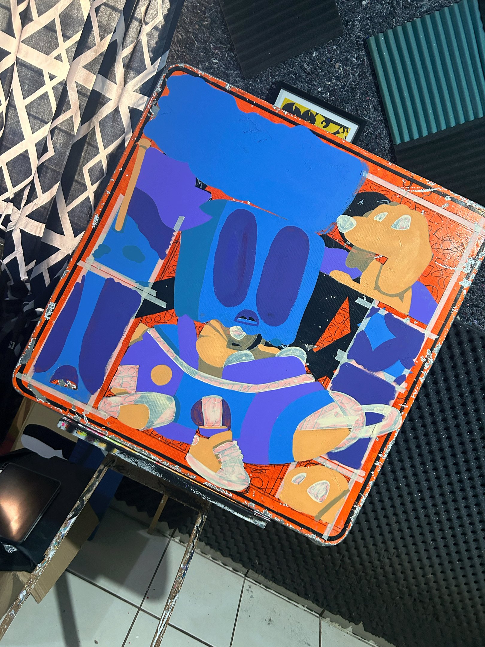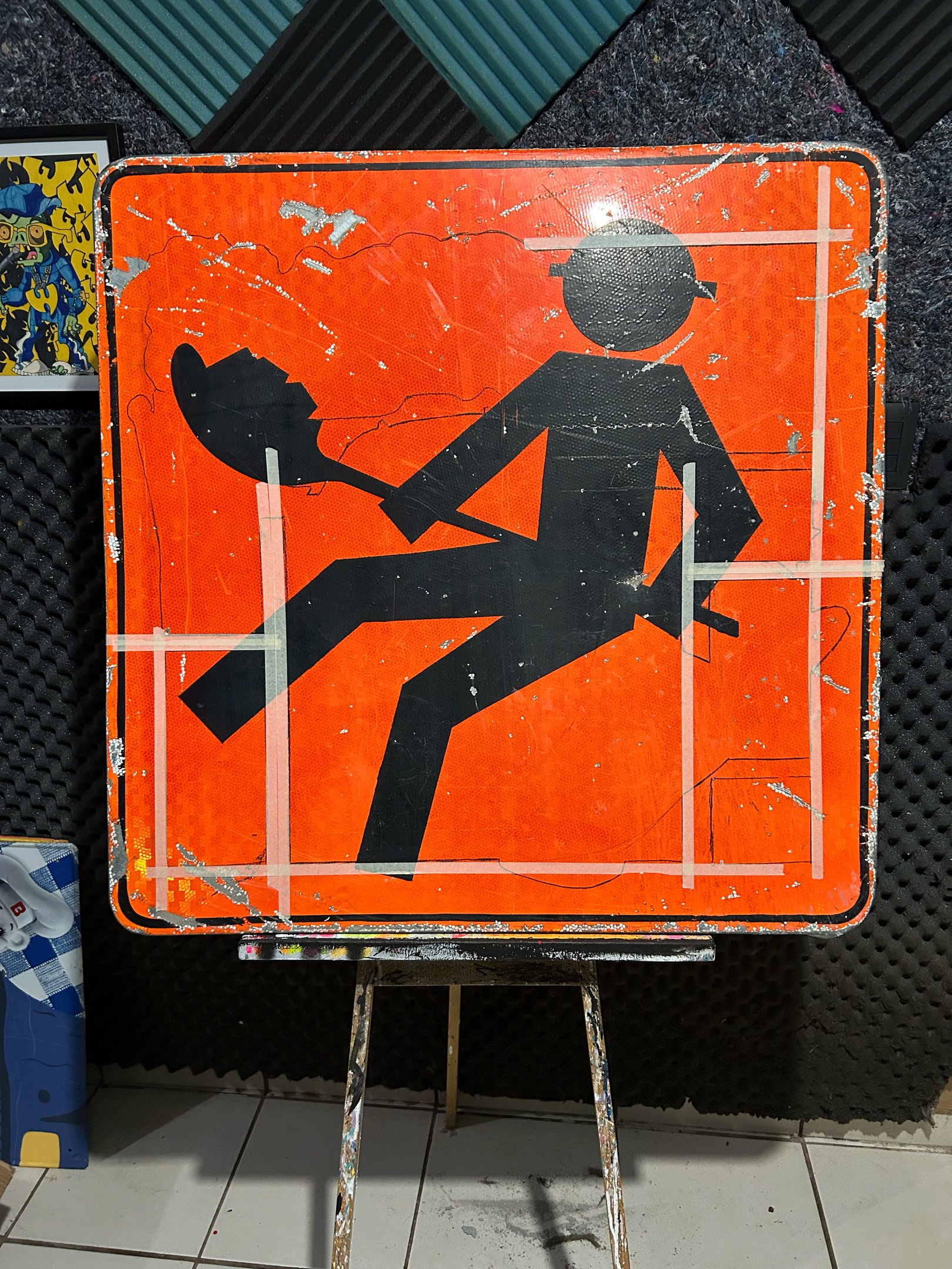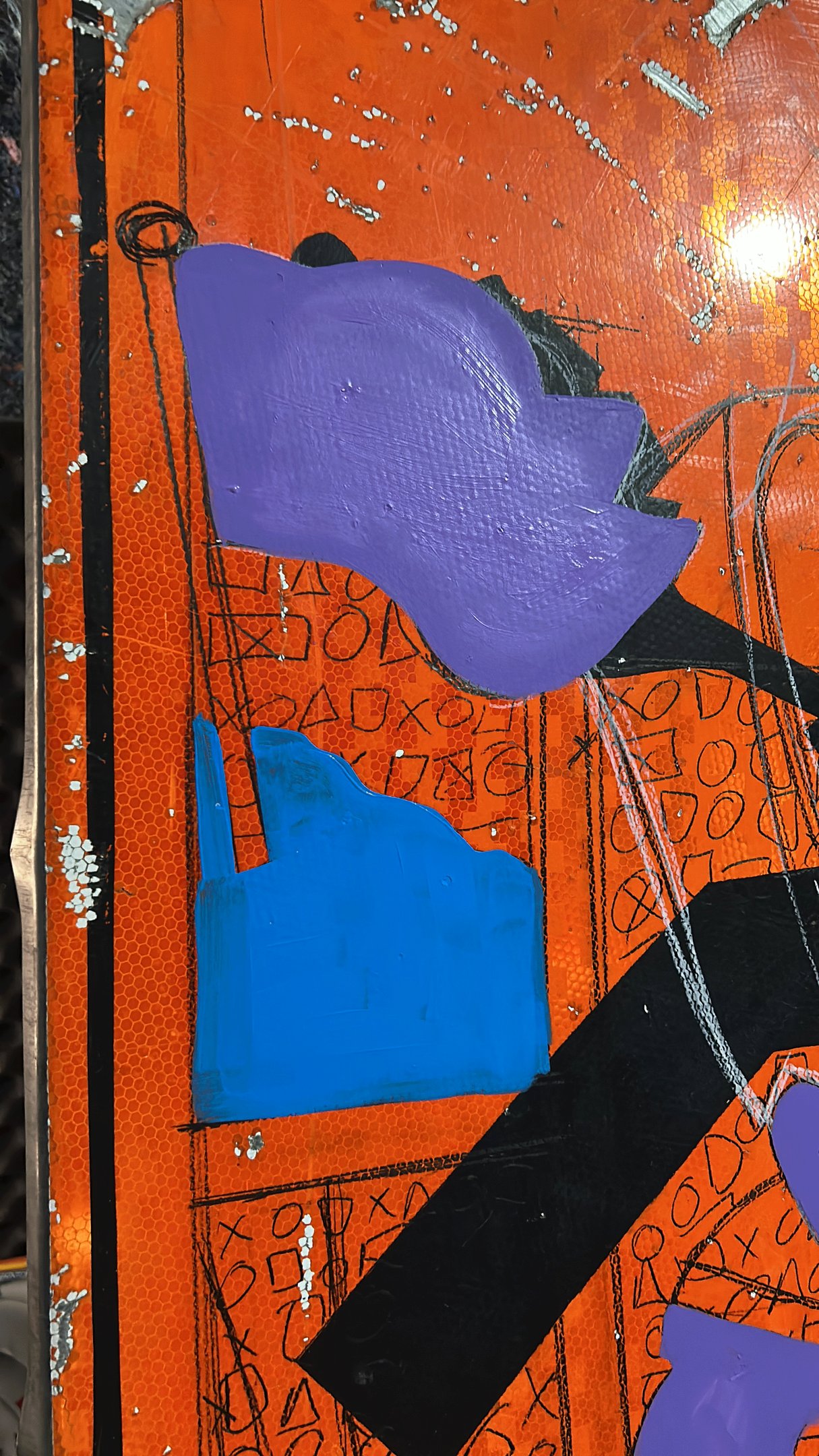 Fui invitado a participar en esta expo la cual fue relacionada al skate, donde la mayoría de los artistas pintaron patinetas para seguir con el concepto. Sin embargo, a algunos artistas nos ofrecieron intervenir unos letreros de metal de construcción, lo cual fue mucho más gratificante de lo que inicialmente había anticipado. Pintar esos letreros me permitió explorar nuevas técnicas y conceptos, permitiéndome jugar con una composición cuadrada y utilizar el reflector de metal para aportar un elemento luminoso y dinámico a la obra. Además, el material en sí dio una textura interesante que contrastaba con el color de la pintura, creando un efecto visual único que llamaba la atención del espectador.