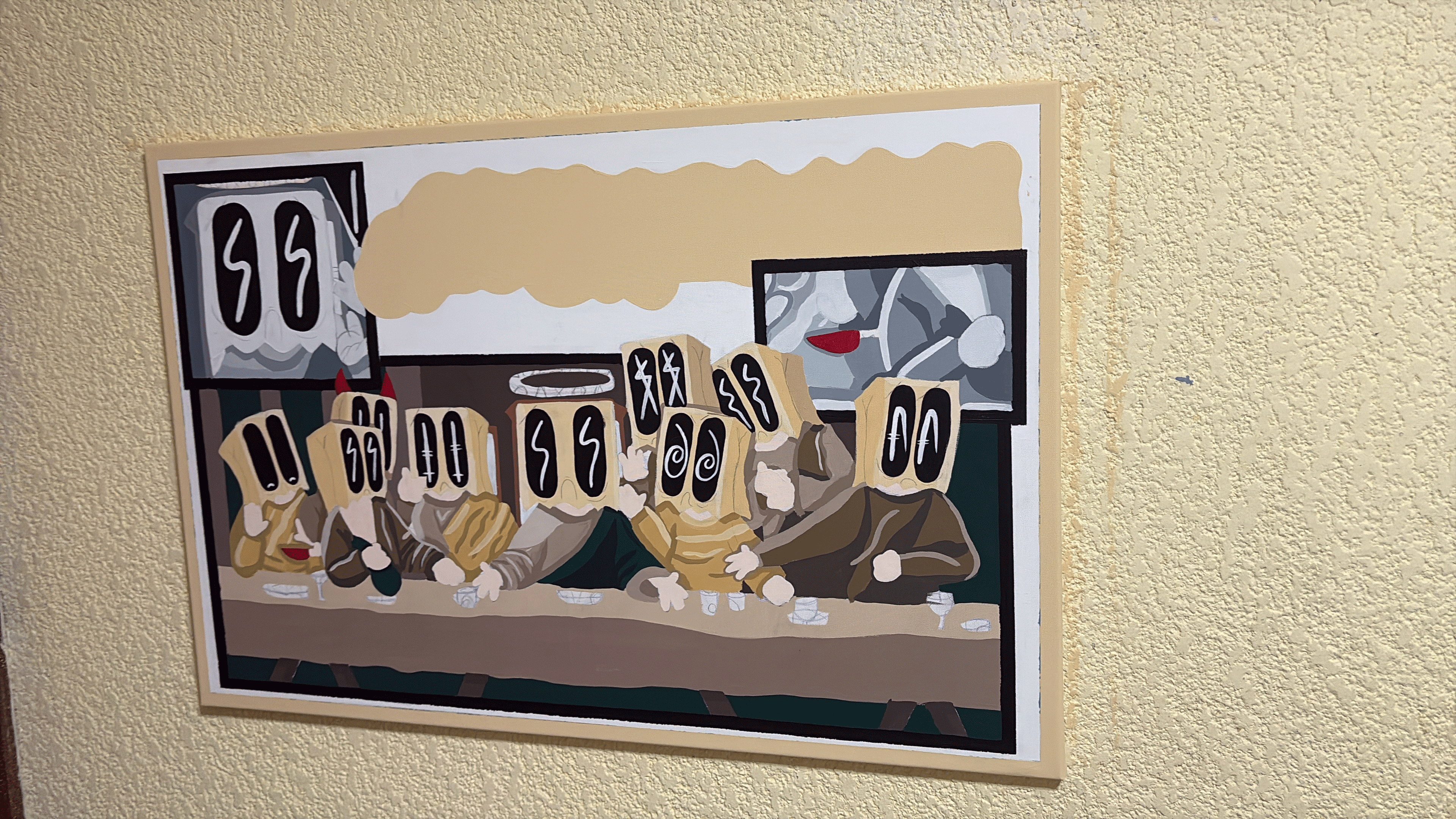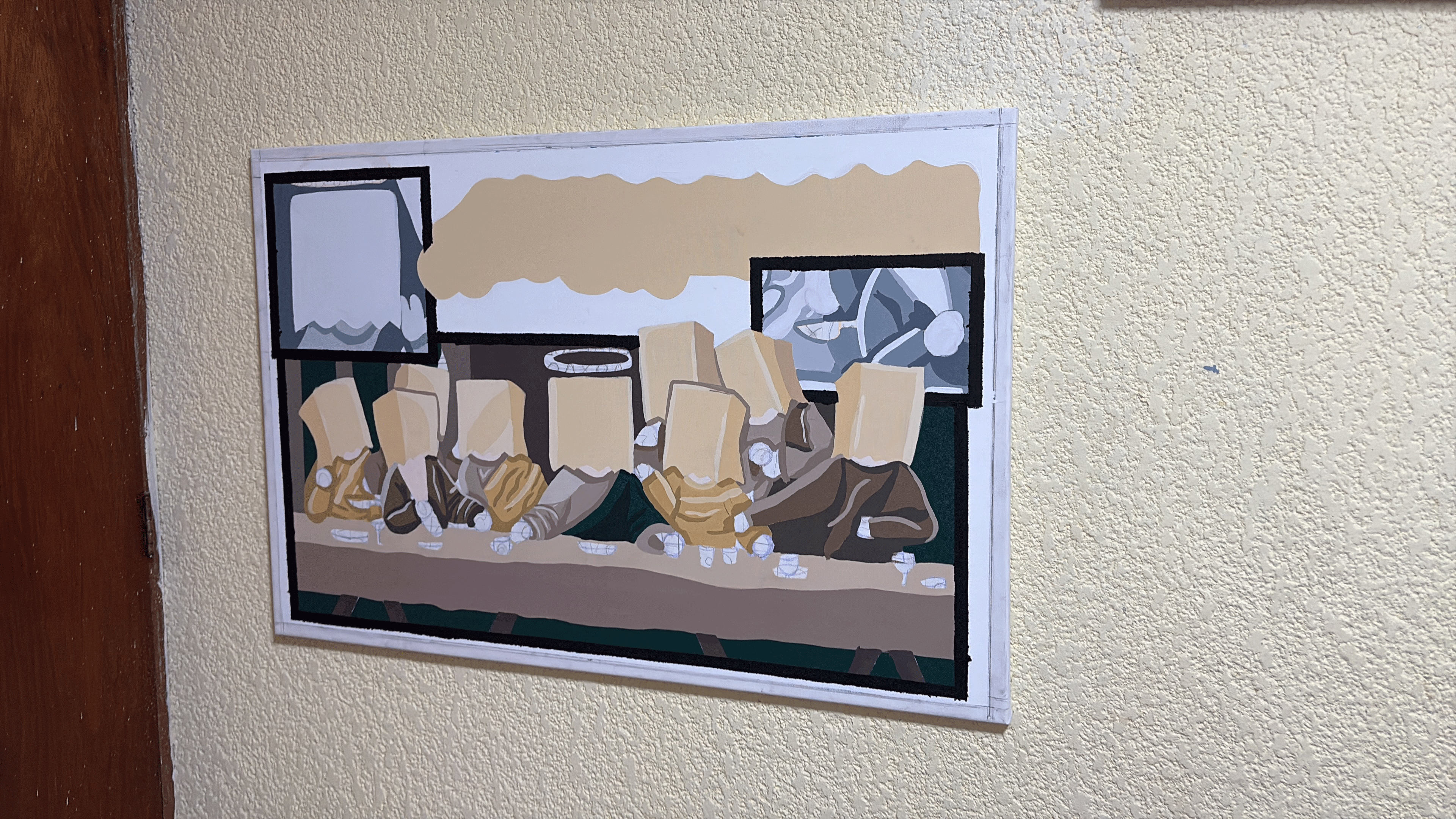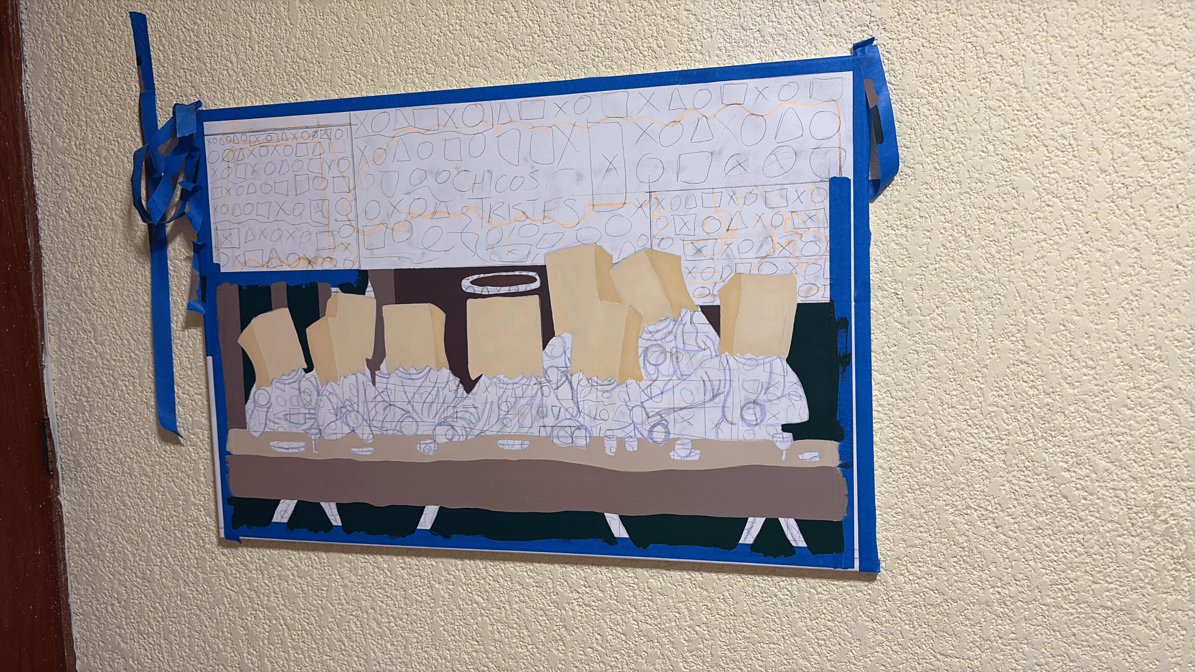 Cuando me invitaron a participar en esta galería, al principio no sabía qué realizar, ya que se realizaría con temática católica, alineada con las tradiciones y celebraciones de la Semana Santa. En este contexto, la presión de crear una obra significativa era alta, lo que generó en mí una gran reflexión sobre el tema. Pasé mucho tiempo pensando en cómo podría transmitir la esencia y el significado de esta festividad tan importante. Después de varios bocetos que no lograban agradarme, decidí centrarme en la representación de la Última Cena, un tema que resonaba profundamente en mi interior. En esta obra, elegí resaltar el cuchillo de Judas, simbolizando la traición y la tensión en ese momento crucial. Además, opté por utilizar una paleta de colores verdes y cafés, colores que se usaban en las pinturas de esa época, lo que les daba un toque auténtico y lleno de historia. Cada trazo que realizaba parecía cobrar vida, y cada vez que me detenía a observar mi trabajo, me sentía más conectado con el mensaje que quería transmitir. Al final, esta obra no solo se convirtió en un proyecto artístico, sino en una reflexión personal sobre la fe, la traición y el sacrificio que son tan centrales en estas narrativas religiosas.